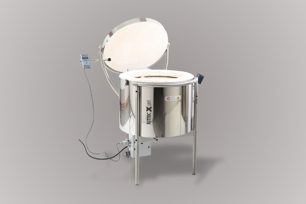 The kilns of the new KITTEC X-LINE top-loader set new standards. Every model, from the X 40 to the X 210, has the same ergonomic working height and a guard bracket in the loading edge area. The well-tried “clever” lid opening is now supported by the X handle – the lid can be easily opened and closed by hand. All parts of the frame are made from stainless steel. Its pendulum mounting ensures that the lid always shuts tight – an innovation.